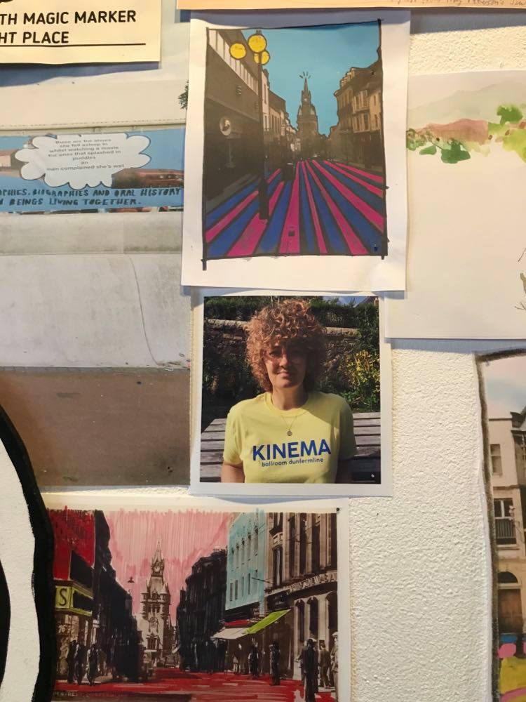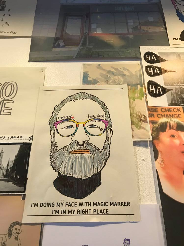 Nightlife, clubbing, music and the stories that emerge from the crossover between these three have always been important in Alan’s work. We are greeted at the entrance to the show by a giant portrait of Barbara Dickson; one of the other characters that form the pillars to the show is Colin, a man who has built a remarkable online archive of every gig that ever took place in Dunfermline’s Kinema ballroom. A new series of T-shirts, featuring the logos of old Dunfermline night spots, has been launched, and no doubt will begin another series of conversations and mudlarking amongst half submerged memories for future drawings and stories. And, it wouldn’t be a Workspace show without some laugh out loud puns. There’s a portrait of the genuinely ludicrous P Diddy, the American rapper-turned-human-commodity once known as Sean “Puffy” Combs, who lost all contact with reality sometime late in the last century. The caption underneath, DIDDY FUCK (Did He Fuck) presumably lets us know that he’s yet to grace the Kinema.