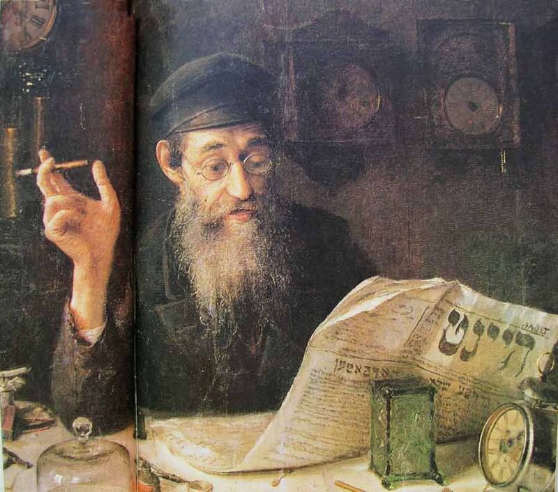 In retrospect, Pen’s portrait functions as an image of a life that was fast disappearing. Enjoying a moment’s peace from his work, the clockmaker smokes and studies a local newspaper in Yiddish. With sympathy and verve, Pen uses the tools of an experienced portraitist, using dramatic props (finished and unfinished clocks; tools; artificial light; clothes and the newspaper to give us a precise understanding of who this character is, and of his role and position in society. It was this kind of portraiture that Pen tried to impart on those who came to study with him at his house-cum-studio on Gogol Street in Vitebsk, a building long since demolished. When this work was finished, few could have foreseen that Marc Chagall-Pen’s most promising students- would already have overseen the visual components of a street festival in Vitebsk, celebrating a year of the Bolshevik revolution, and would in January 1919 be appointed director of the Vitebsk people’s art school.