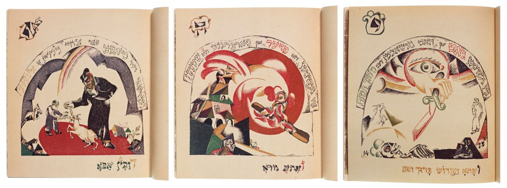 It was in this context that El Lissitzky created his now very familiar poster Beat the Whites with the Red Wedge. Whilst the image can be read literally, as the Communist Reds attacking and forcing back the reactionary forces of the White armies, there is also a geometric ambiguity about the piece; no one new whether the attempt at making a new society of equals would last or be crushed, at this period. The work functions easily as visual propaganda for an audience that was largely illiterate before 1917; yet, in spite of the immediate and urgent revolutionary context in which it was made, the piece also leans heavily on Russian and Jewish antecedents. the work relates in part to the traditions of the lubok, a type of woodblock poster printing that enabled social, political and satirical messages to be conveyed to audiences who had trouble reading; in the same year as this poster was made, Lissitzky, who was fascinated by Jewish material and religious cultures throughout his life, had made a series of woodblock prints in an illustrated book on the subject of Had Gaya (“One Little Goat”), a song traditionally sung at the end of the Jewish Passover festival. That a much more traditional set of images such as these wonderful images shown below, showed the versatility and range of El Lissitzky’s practice during his brief time in Vitebsk. Traditional religious identifications and the role that Jewish people might play in a future Soviet republic sat alongside a desire to promote the Bolshevik cause to the people.